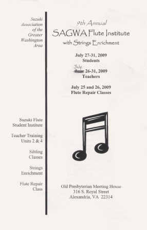 明日から1週間、ワシントンDCのお隣の町Alexandria, VirginiaにてSuzuki Association of Greater Washington DC (SAGWA) Flute Instituteが行われますので、行ってきます。端的に言えばスズキ・フルートスクールの生徒さん、スズキの先生になるトレーニングをしている人たちが毎夏集まるフルート合宿です。最近ではアメリカ各地で同様の合宿が行われるようになってきましたが、ここはその中でも規模の大きいもののひとつです。2004年から毎年呼んでいただいて教えているので、もう6回目になるんですね、、、歳をとったなあ(笑)。